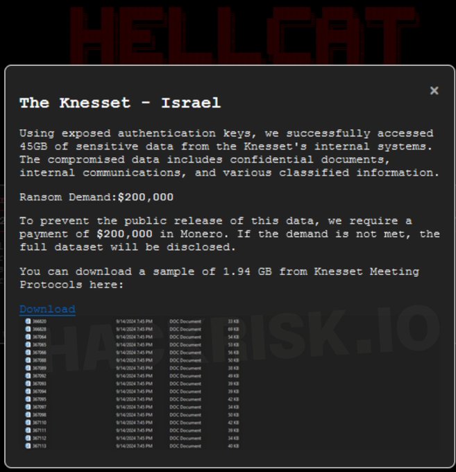 وأشار الموقع، إلى أن مجموعة القرصنة Hellcat تزعم أنها اخترقت الكنيست الإسرائيلي، أعلى سلطة تشريعية وسياسية في دولة الاحتلال.