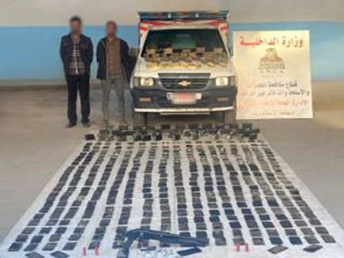 وعقب تقنين الإجراءات تم استهدافهما وأمكن ضبطهما حال استقلالهما سيارة بدائرة القسم، وبحوزتهما 850 طربة لمخدر الحشيش وزنت 85 كيلو جرام مخبأة بمخزن سرى مُعد مسبقًا أسفل السيارة، وبندقية خرطوش، وعدد من الطلقات، وتقدر القيمة المالية للمضبوطات 6،8 مليون جنيه تقريبًا، وتم اتخاذ الإجراءات القانونية.