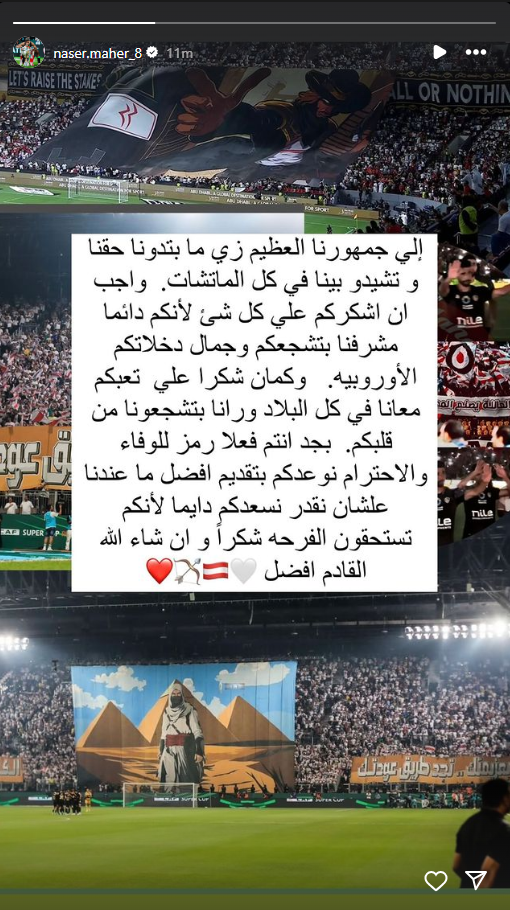 وكتب ناصر ماهر عبر حسابه الرسمي على إنستجرام: إلى جمهورنا العظيم، زي ما بتدونا حقنا وتشيدوا بينا في كل الماتشات واجب إني أشكركم علي كل شيء لأنكم دائما مشرفنا بتشجيعكم وجمال دخلاتكم الأوروبية وكمان شكرا على تعبكم معانا في كل البلاد، ورانا بتشجعونا من قلبكم.