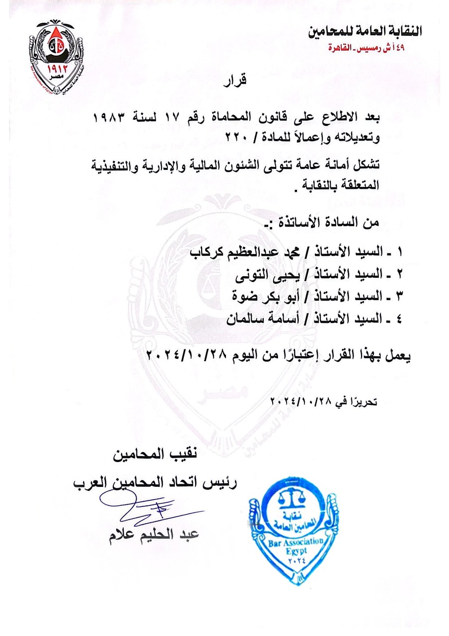 ونص القرار على أنه بعد الاطلاع على قانون المحاماة رقم 17 لسنة 1983 وتعديلاته وإعمالاَ للمادة 220 تشكل أمانة عامة تتولى الشئون المالية والإدارية والتنفيذية المتعلقة بالنقابة.