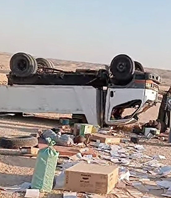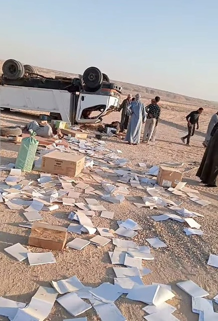 وتلقت مديرية أمن الأقصر، بلاغا من شرطة النجدة يفيد بورود بلاغ من أحد الأهالي عن انقلاب سيارة نقل، محمل عليها أوراق عهدة تبع احد القطاعات، وبداخلها 3 أشخاص مصابين بينهم حالة حرجة على طريق الصحراوي الشرقي طيبة.