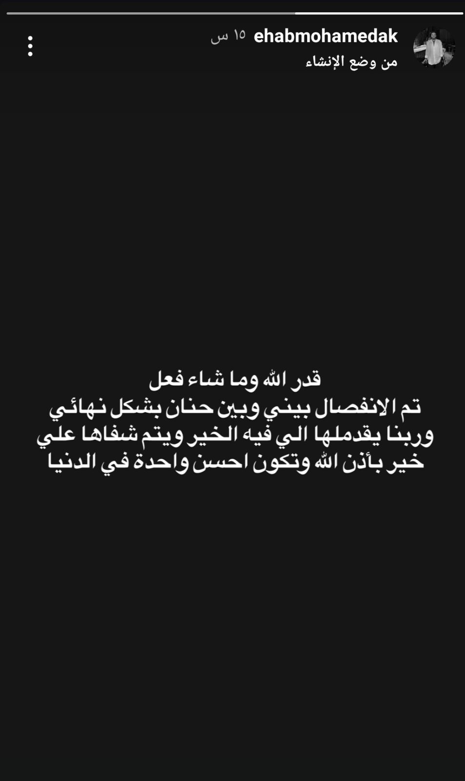 ومن جانبه، أعلن إيهاب خلال استوري سابقة: قدر الله وما شاء فعل، تم الانفصال بيني وبين حنان بشكل نهائي وربنا يقدملها اللي فيه الخير ويتم شفاها على خير بإذن الله وتكون احسن واحدة في الدنيا.