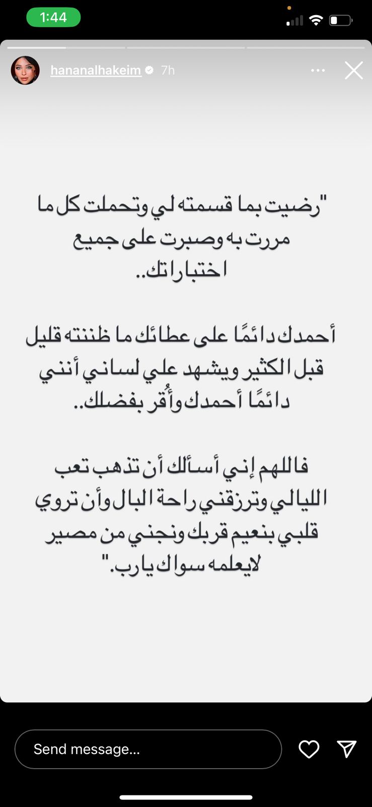 وكتبت حنان: رضيت بما قسمته لي وتحملت كل ما مررت به، أحمدك دائمًا على عطائك ما ظننته قليل قبل الكثير ويشهد على لساني أنني دائمًا أحمدك وأقر بفضلك.