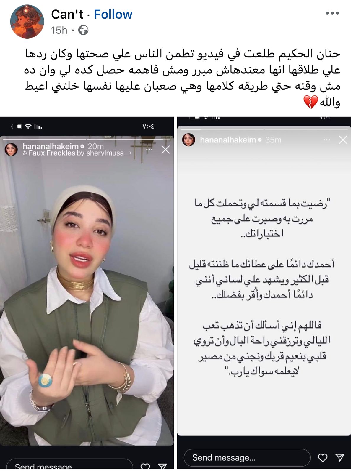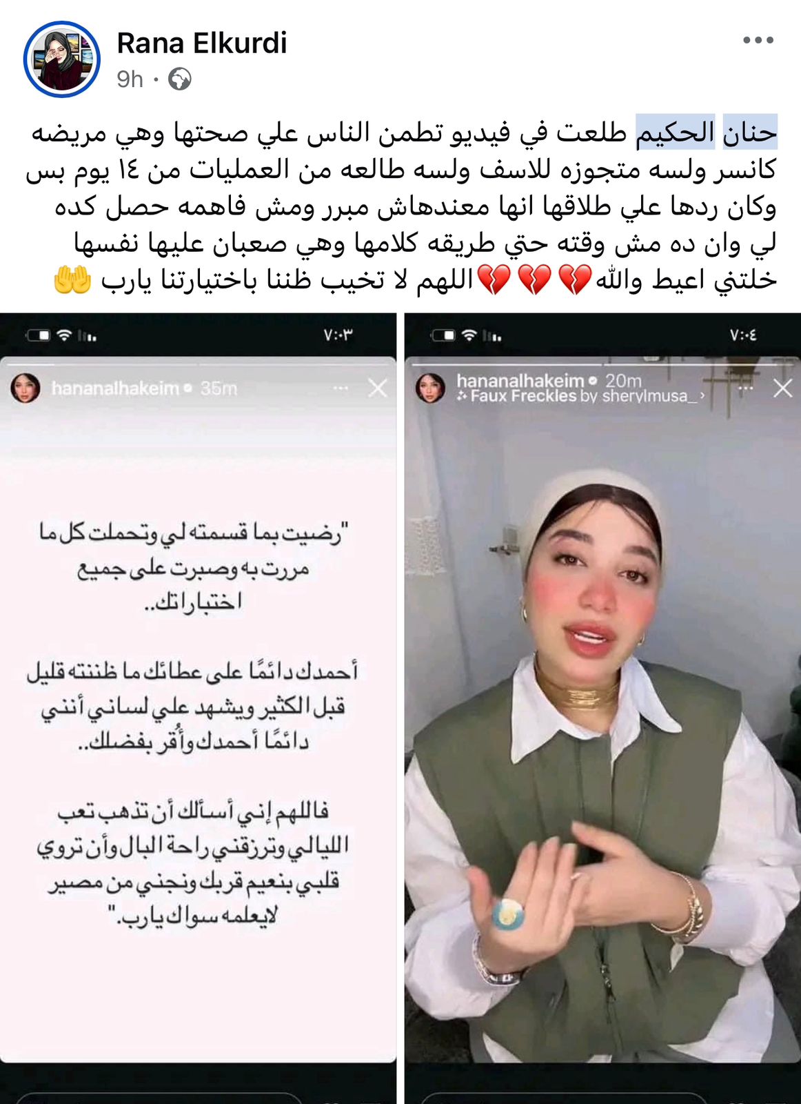 تزامنًا مع إعلان إيهاب محمد زوج البلوجر حنان الحكيم نبأ طلاقهما خلال ستوري عبر حسابه الشخصي على منصة تداول الصور والفيديوهات إنستجرام، ظهرت حنان في فيديو قصير لتطمئن جمهورها بعد ذلك الخبر الذي صدم الجميع بـ إعلان توقيته فور انتهائها من عملية جراحية خطيرة أدت إلى استئصال الثدي بسبب إصابتها بالسرطان.