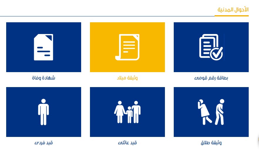 - اختر خانة قطاع الأحوال المدنية ثم اختر شهادة ميلاد.