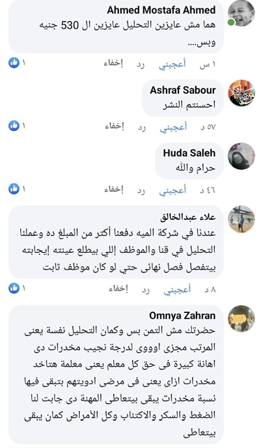 وقال أحدهم عبر فيس بوك أنه يتم خصم مبلغ شهري ليس بالقليل منهم من أجل التأمين الصحي، متسائلين عن السبب وراء عدم إدراج التحليل ضمن خدمات التأمين الصحي.