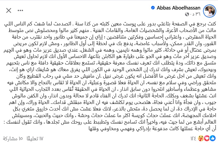 وكتب عباس أبو الحسن منشورًا عبر حسابه الشخصي بموقع فيسبوك جاء فيه: كنت برجع في الصفحة بتاعتي بدور على بوست معين كتبته من كذا سنة، اتصدمت لما شفت كم الناس اللي ماتت من الأصحاب الأعزة، والشخصيات العامة، والقامات الفنية، منهم كتير ماتوا ومحصلوش نص متوسط الحياة المفترض.