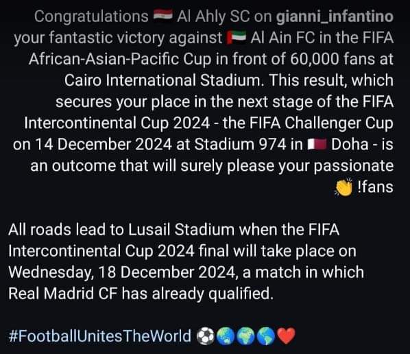 كتب إنفانتينو عبر حسابه الرسمي على إنستجرام: تهانينا للأهلي على فوزه الرائع على العين الإماراتي في بطولة كأس أفريقيا وآسيا والمحيط الهادئ أمام 60 ألف مشجع في استاد القاهرة الدولي.