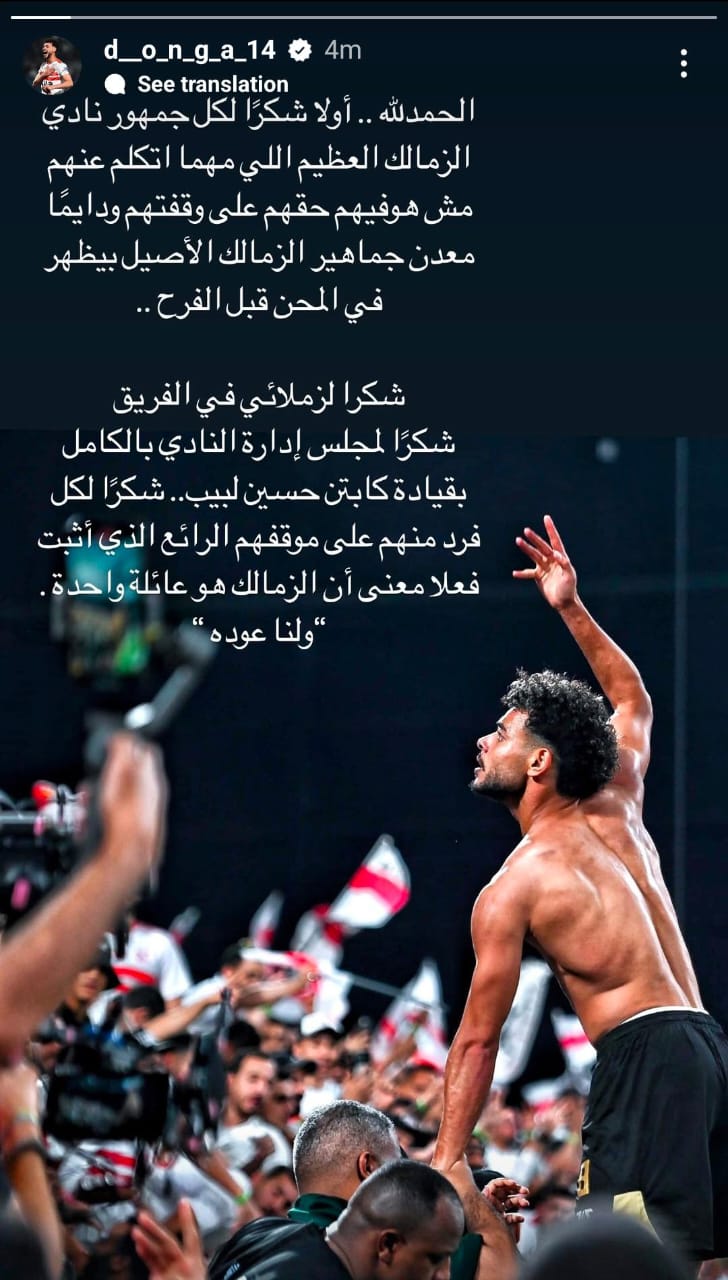 وقال نبيل عماد دونجا عبر حسابه الرسمي على انستجرام: الحمد لله.. أولا شكرا لكل جمهور نادي الزمالك العظيم اللي مهما أتكلم عنهم مش هوفيهم حقهم على وقفتهم ودايمًا معدن جماهير الزمالك الأصيل بيظهر في المحن قبل الفرح.