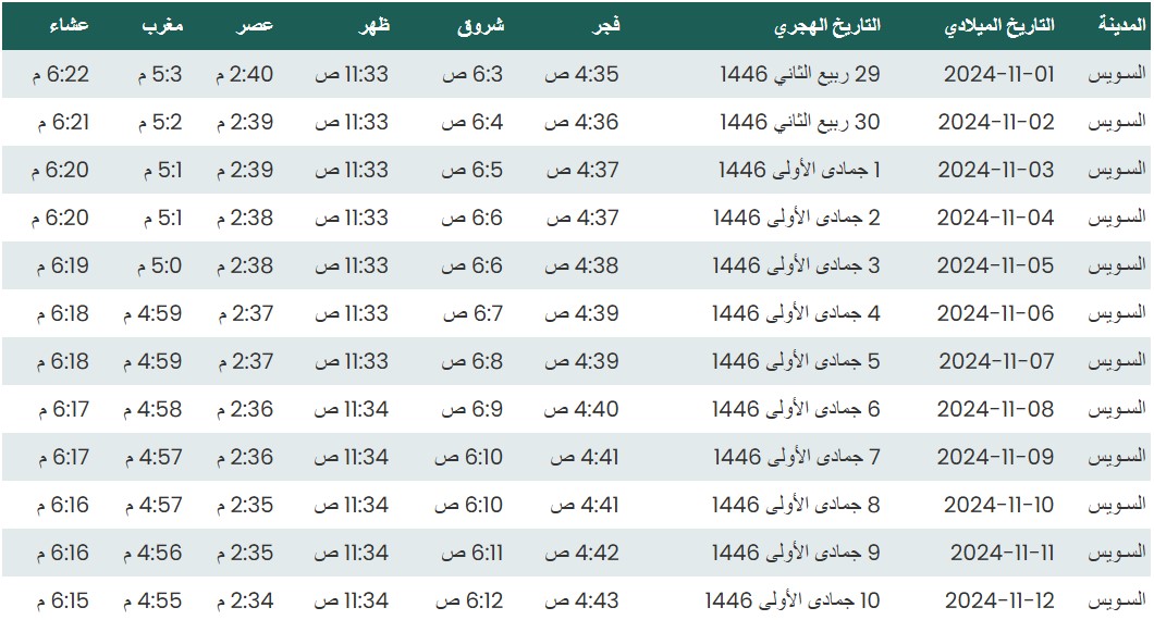 مواقيت الصلاة السويس 2024