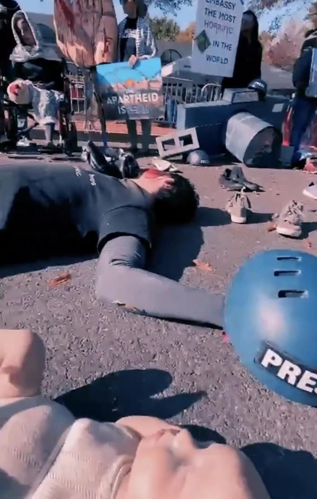 وحسب ما نقلته TRT World News، تظاهر بعض النشطاء السياسيون بـ ولاية واشنطن في أمريكا في وقفة احتجاجية أمام السفارة الإسرائيلية، من خلال تمثيل واقع غزة الذي يشهد سيول الدماء يومًا تلو الآخر منذ العام الماضي.