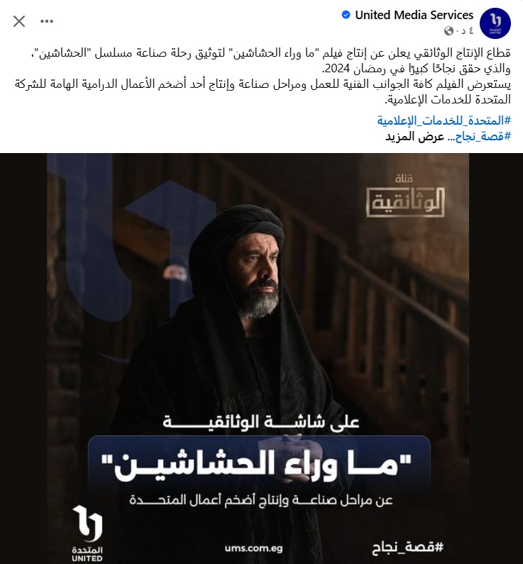 ونشرت الشركة المتحدة عبر حسابها الرسمي بموقع التواصل الاجتماعي فيسبوك، منشورا جاء به: قطاع الإنتاج الوثائقي يعلن إنتاج فيلم ما وراء الحشاشين لتوثيق رحلة صناعة مسلسل الحشاشين، والذي حقق نجاحًا كبيرًا في رمضان 2024.