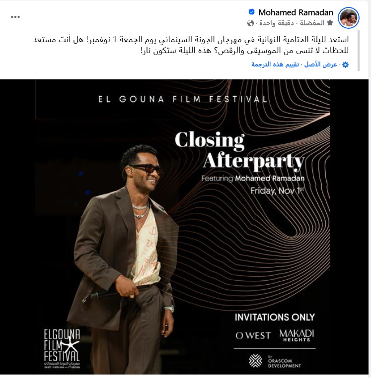ونشر محمد رمضان صورة على حسابه الخاص فيس بوك، معلقًا: استعد لليلة الختامية النهائية في مهرجان الجونة السينمائي غدًا الجمعة 1 نوفمبر.