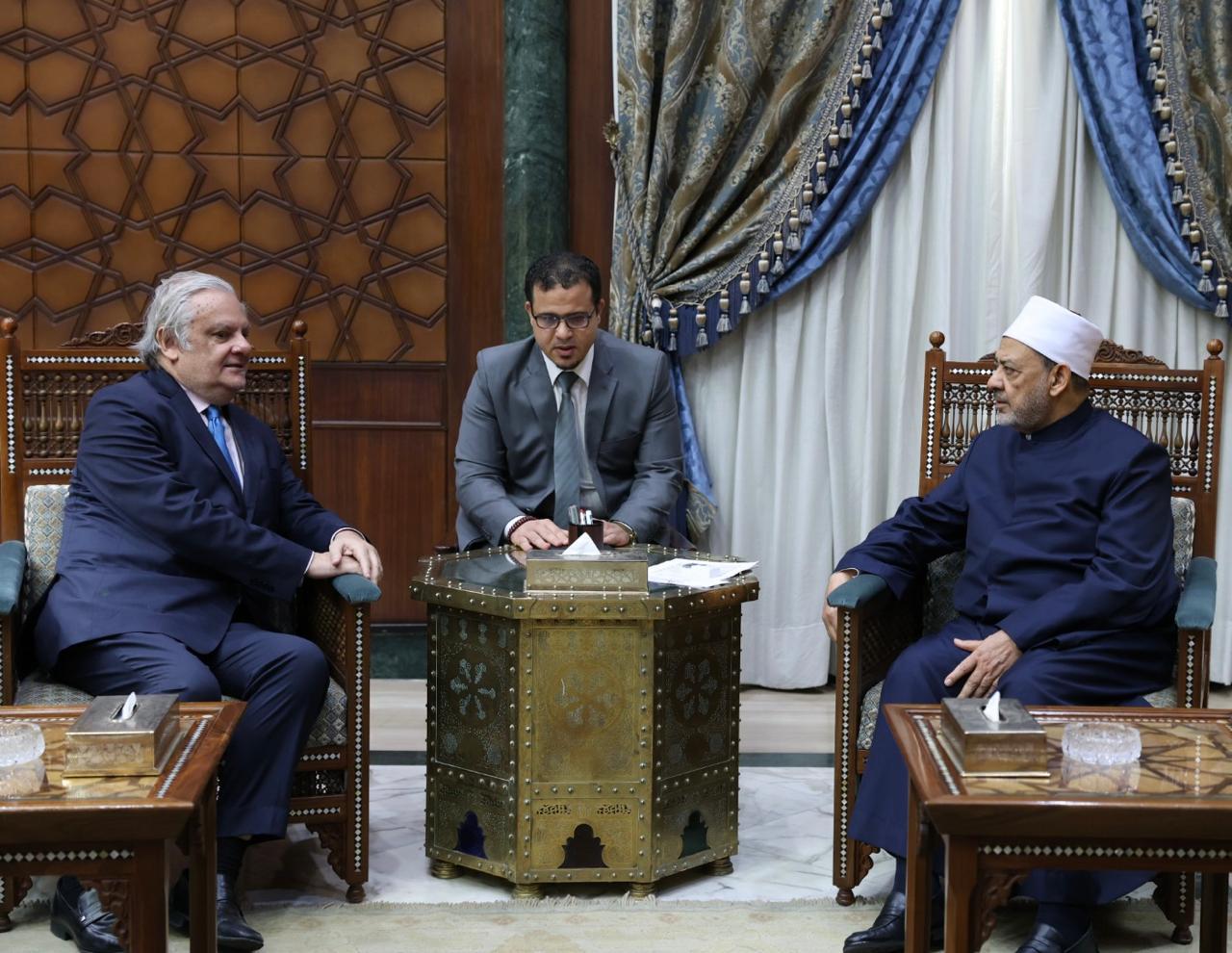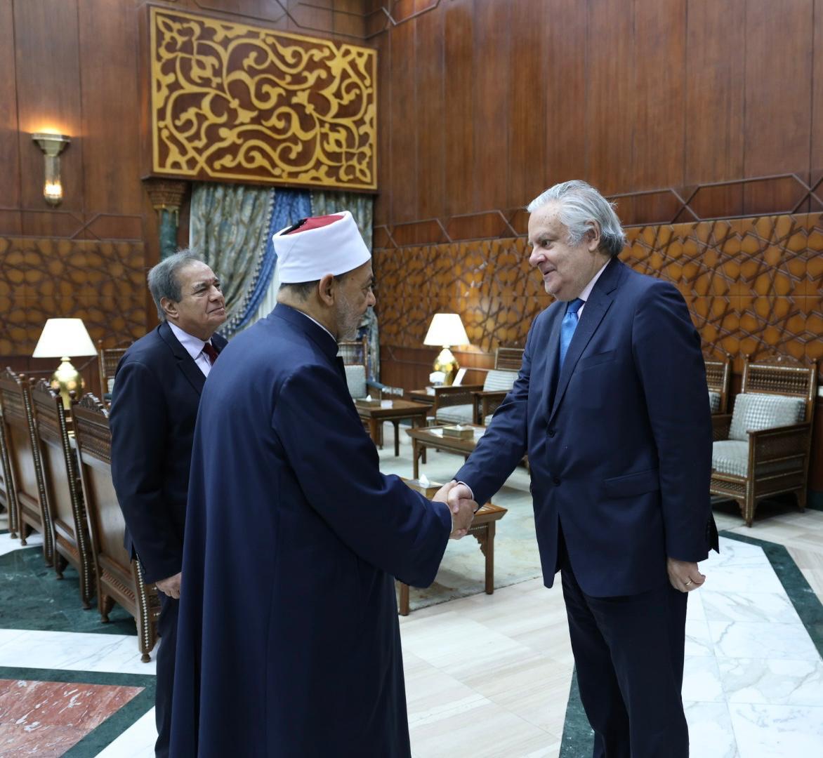 استقبل الإمام الأكبر الدكتور أحمد الطيب، شيخ الأزهر الشريف، اليوم الخميس بمشيخة الأزهر، السفير خوسيه خيسوس، سفير البيرو لدى القاهرة.