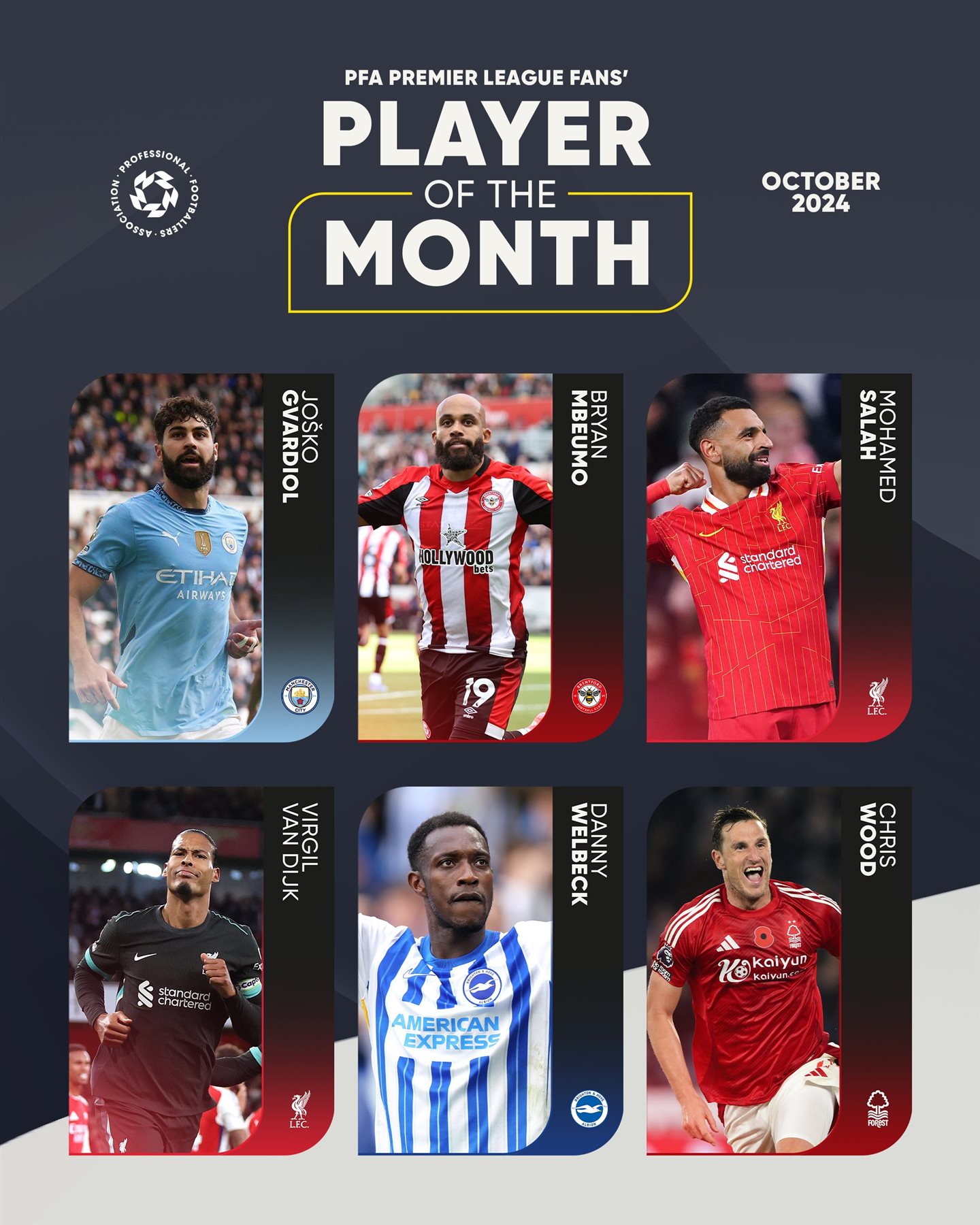 أعلنت رابطة اللاعبين المحترفين قائمة المرشحين لجائزة أفضل لاعب في الدوري الإنجليزي عن شهر أكتوبر، والتي ينافس عليها محمد صلاح نجم ليفربول وقائد المنتخب الوطني.