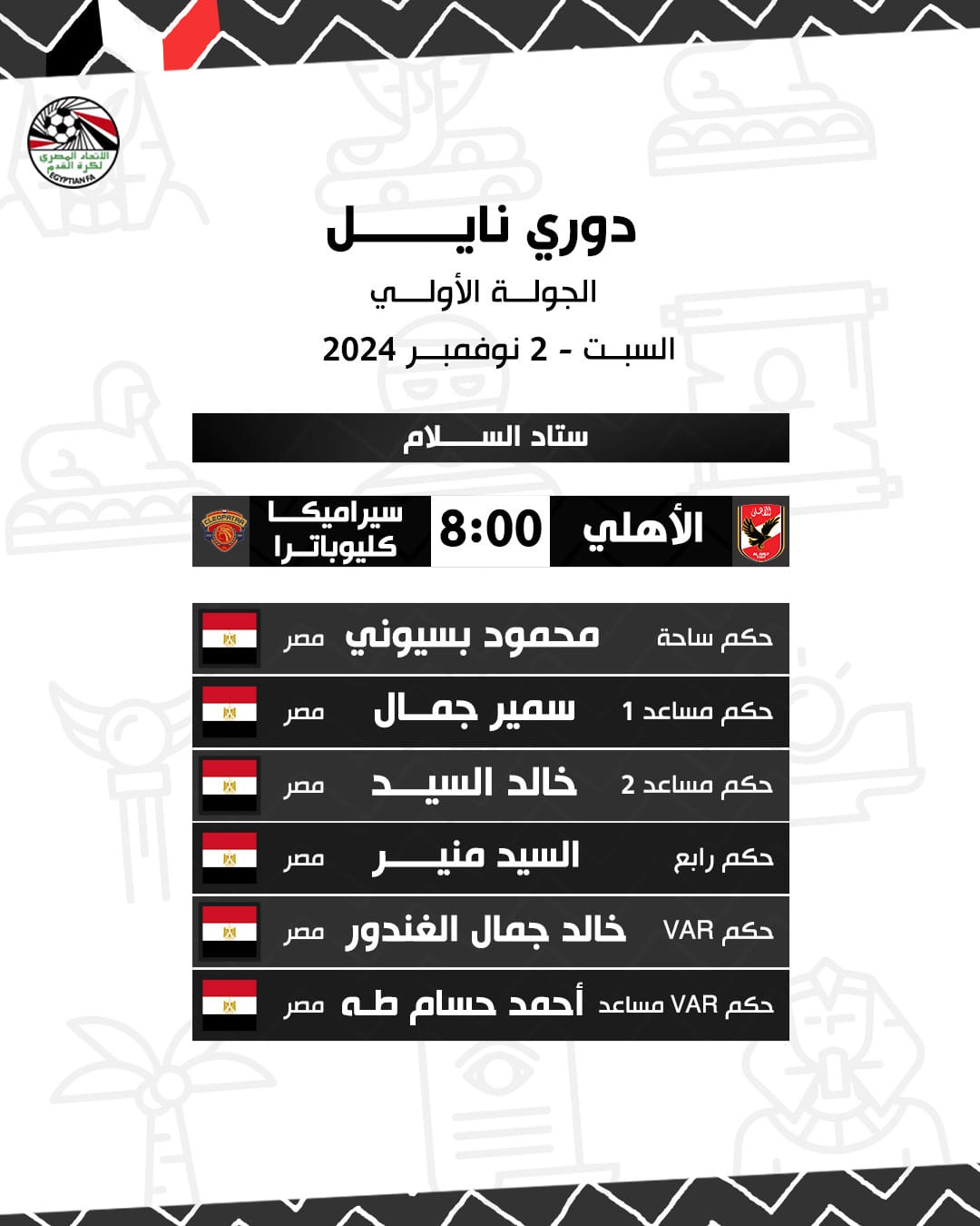 وأكدت لجنة الحكام خبر القاهرة 24 الذي سبق وأعلن إسناد إدارة مباراة الأهلي وسيراميكا كليوباترا لـ محمود بسيوني.