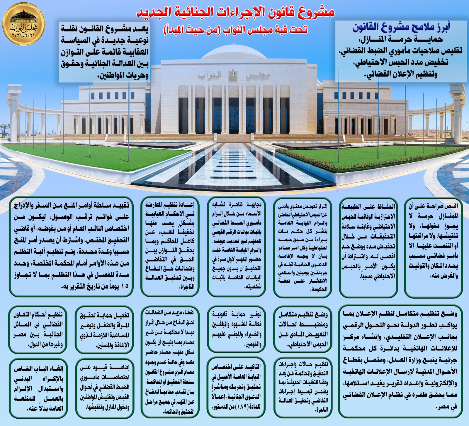 - مشروع القانون المعروض انتهج نهجا جديدا تمثل في تلافي المشكلات العملية التي ظهرت أثناء تطبيق القانون الحالي وتم معالجتها، كما أنه يعد نقلة نوعية وموضوعية نحو تحقيق عدالة ناجزة حقيقية، تؤسس لدولة ديمقراطية حديثة قائمة على سيادة القانون، فهو بمثابة ثورة تشريعية إجرائية في مجال العدالة الجنائية، يسعى نحو تحقيق آمال ومتطلبات المصريين، مسايرًا للتطور التقني الذي شهده العالم، محققا التوازن بين الصالح العام وحماية الحقوق والحريات بشكل فاعل.
