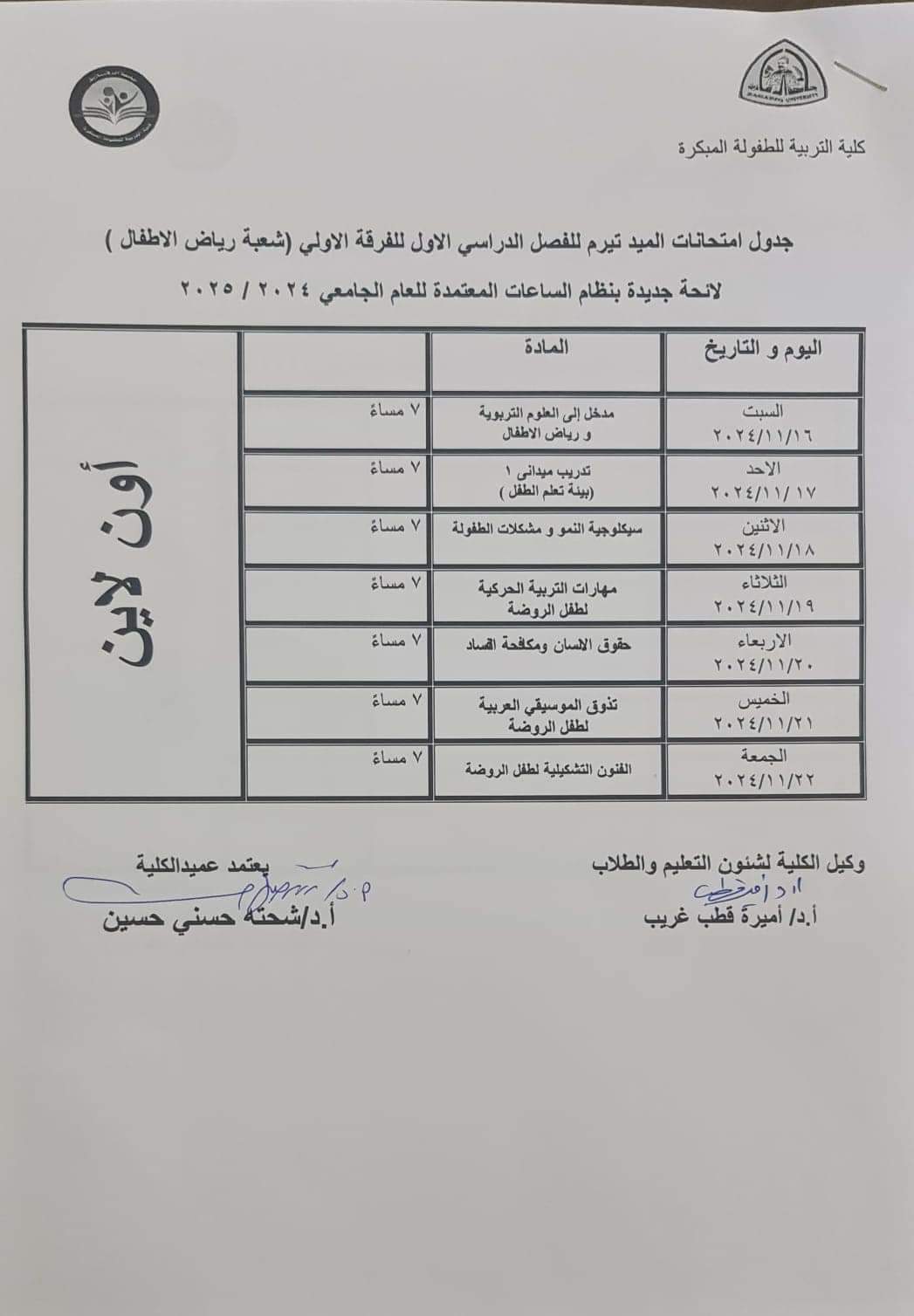 جدول امتحانات الميدتيرم لطالبات الفرقة الأولى