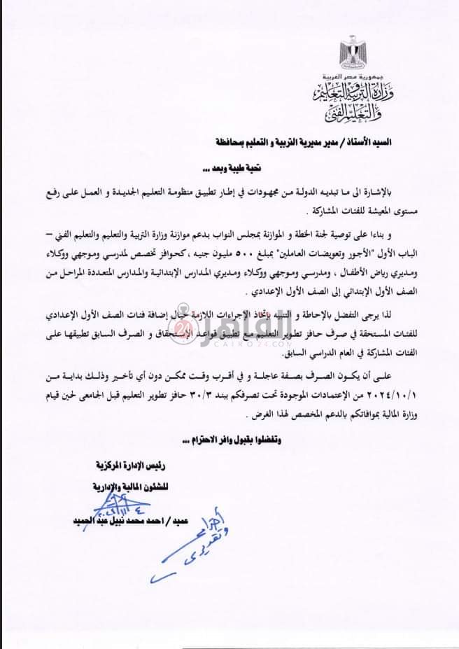 وقالت التعليم في خطابها الذي عممته على المديريات وحصلت عليه القاهرة 24، إن الصرف سيكون بصفة عاجلة، وفي أقرب وقت ممكن دون أي تأخير وذلك بداية من 1/ 101/ 2024، من الاعتمادات الموجودة تحت تصرفكم ببند 3/ 30 حافز تطوير التعليم قبل الجامعي لحين قيام وزارة المالية بموافاتكم بالدعم المخصص لهذا الغرض.