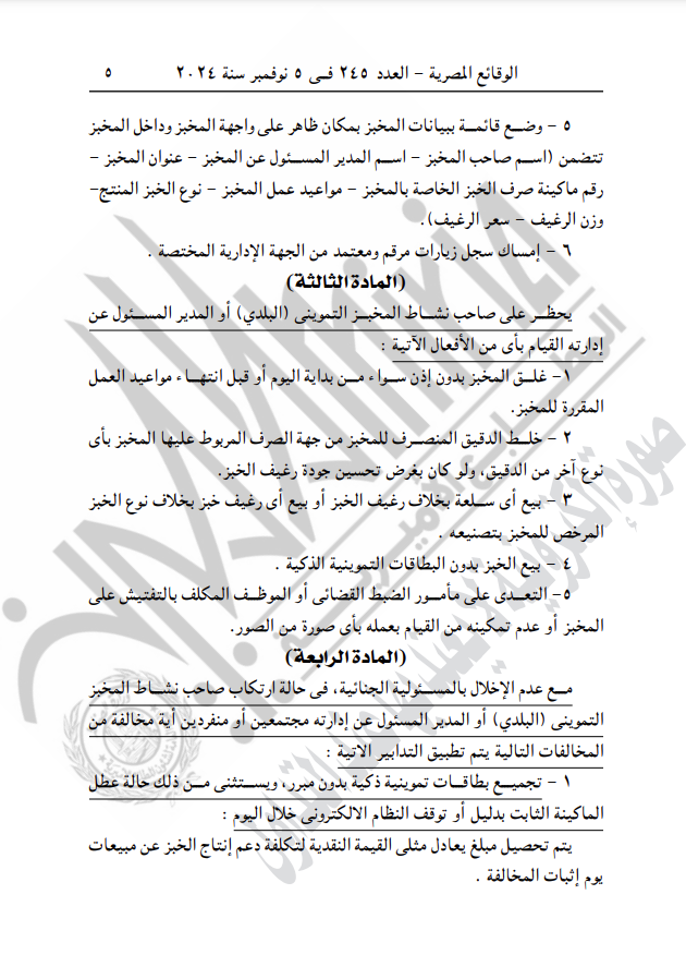 وجاء قرار المادة الثانية كالآتي: ويكون صاحب نشاط المخبز التمويني (البلدي) أو المدير المسئول عن إدارته مسئولًا مسئولية شخصية مجتمعين أو منفردين عن تشغيل المخبز، ويلتزم كل منهما بما يلي:
