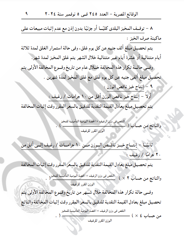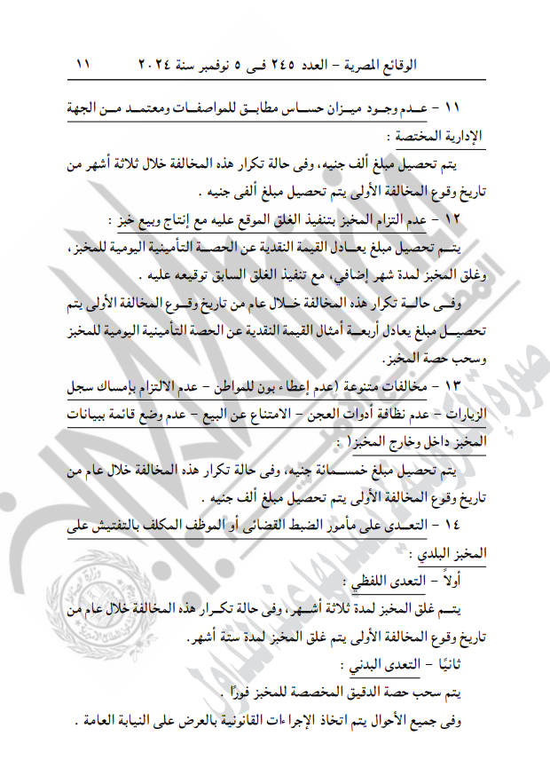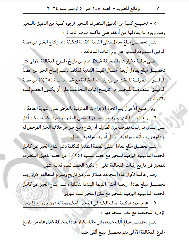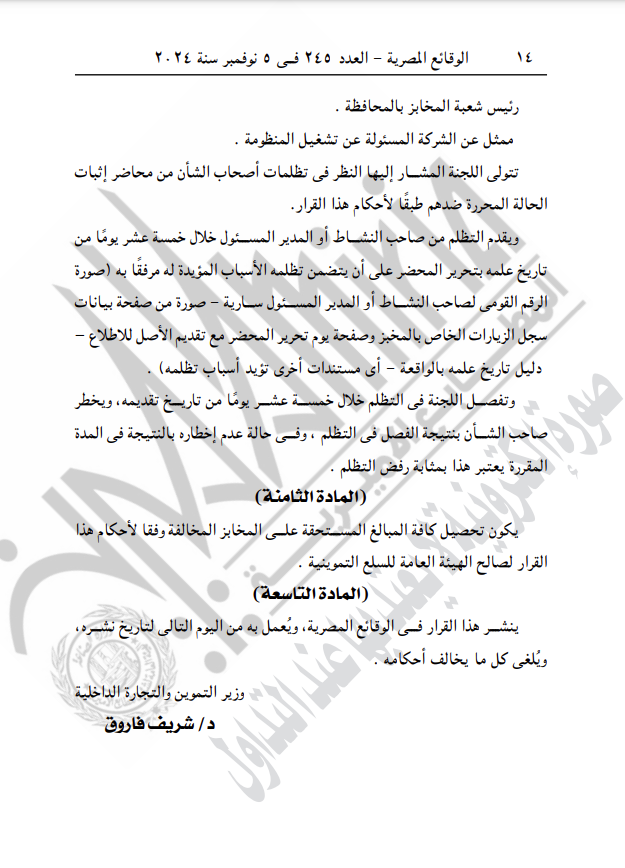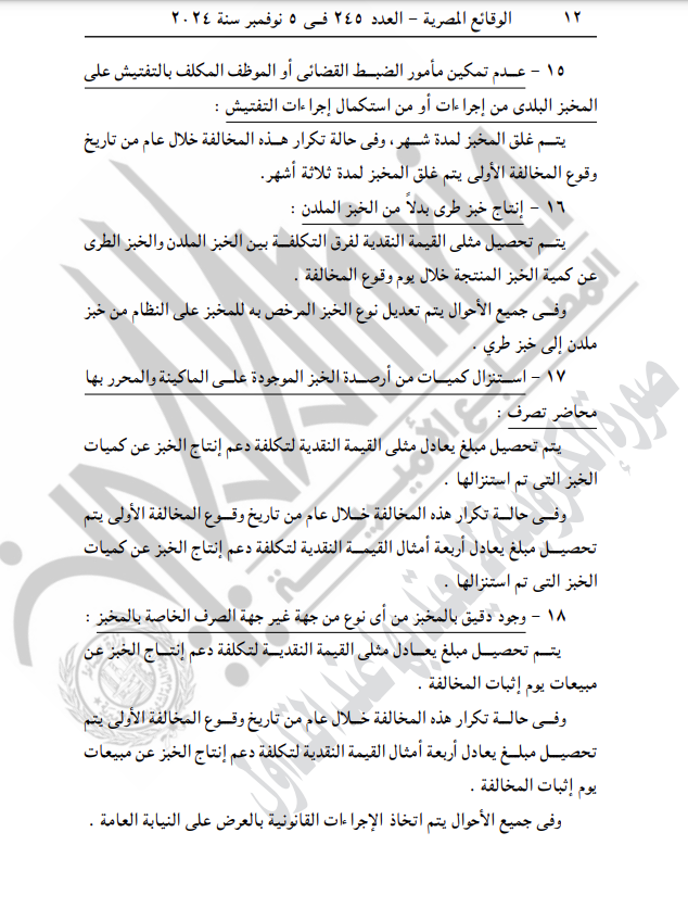 نشرت جريدة الوقائع المصرية في عددها رقم 245، الصادر في 5 نوفمبر 2024، قرار وزارة التموين والتجارة الداخلية رقم 175 لسنة 2024، بشأن تطبيق منظومة الخبز البلدي الحالية، وحق صاحب المخبز رفض استلام كمية الدقيق الواردة إليه إذا كانت غير مطابقة للمواصفات.