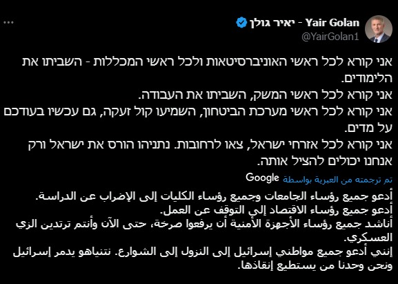 وكتب جولان على صفحته الرسمية بموقع إكس: أدعو جميع رؤساء الجامعات والكليات إلى تعليق الدراسة، وأحث جميع رؤساء القطاعات الاقتصادية على التوقف عن العمل احتجاجًا على هذه الخطوة.