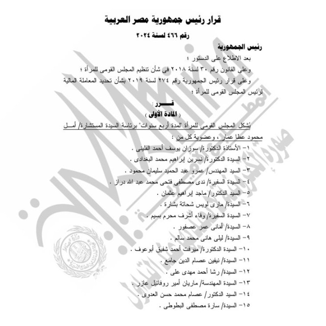 وأصدر الرئيس عبد الفتاح السيسي، قرارًا جمهوريًا، بالتشكيل الجديد للمجلس القومي للمرأة، برئاسة المستشارة أمل محمود عطا عمار، والذي يستمر لمدة 4 سنوات.