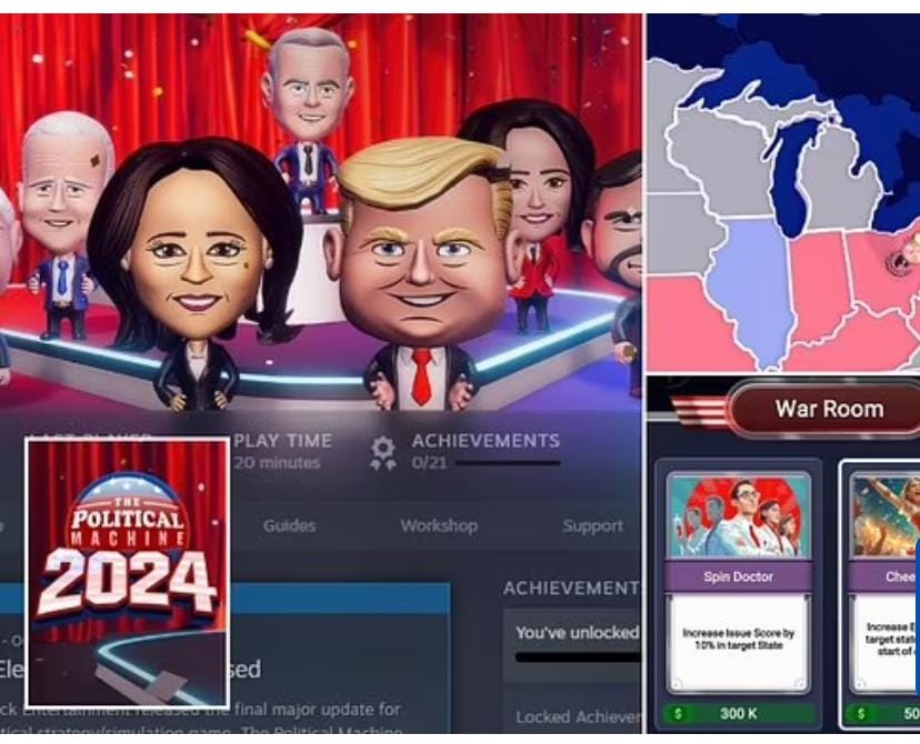 تنبأت لعبة فيديو تسمى الآلة السياسية، بنتيجة الانتخابات الأمريكية 2024، حيث توقعت فوز دونالد ترامب بالبيت الأبيض.