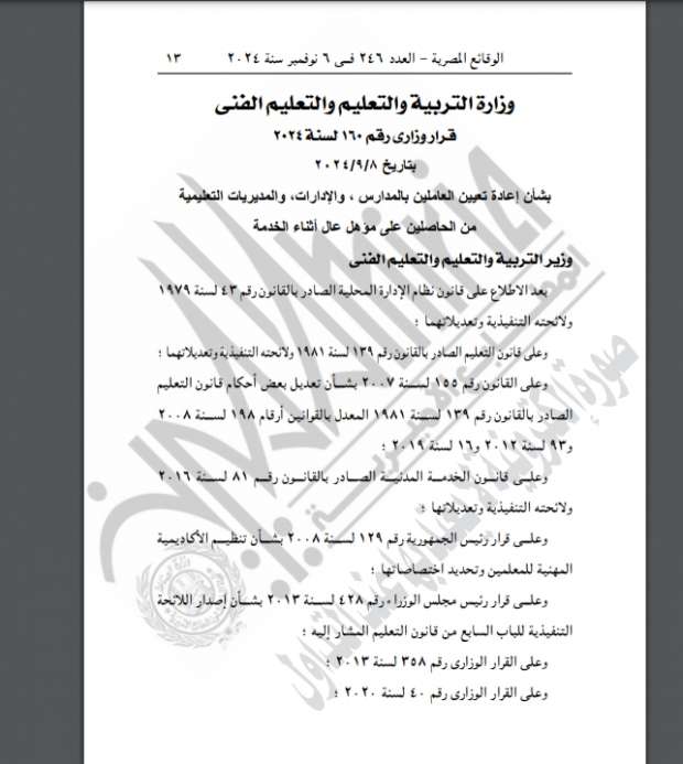 نشرت الجريدة الرسمية قرار وزير التربية والتعليم والتعليم الفني رقم 160 لسنة 2024، بشأن إعادة تعيين العاملين بالمدارس، والإدارات، والمديريات التعليمية من الحاصلين على مؤهل عال أثناء الخدمة.