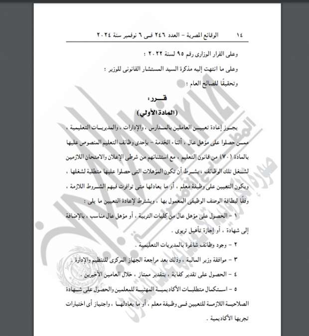 حيث نص القرار كالآتي: على أنه يجوز إعادة تعيين العاملين بالمدارس، والإدارات، والمديريات التعليمية الذين حصلوا على مؤهل عالٍ، أثناء الخدمة - بإحدى وظائف التعليم المنصوص عليها بالمادة 70 من قانون التعليم، مع استثنائهم من شرطي الإعلان والامتحان اللازمين لشغل تلك الوظائف بشرط أن تكون المؤهلات التي حصلوا عليها متطلبة لشغلها، ويكون التعيين على وظيفة معلم، أو ما يعادلها متى توافرت فيهم الشروط اللازمة وفقا لبطاقة الوصف الوظيفي المعمول بها، ويشترط لإعادة التعيين ما يلي: