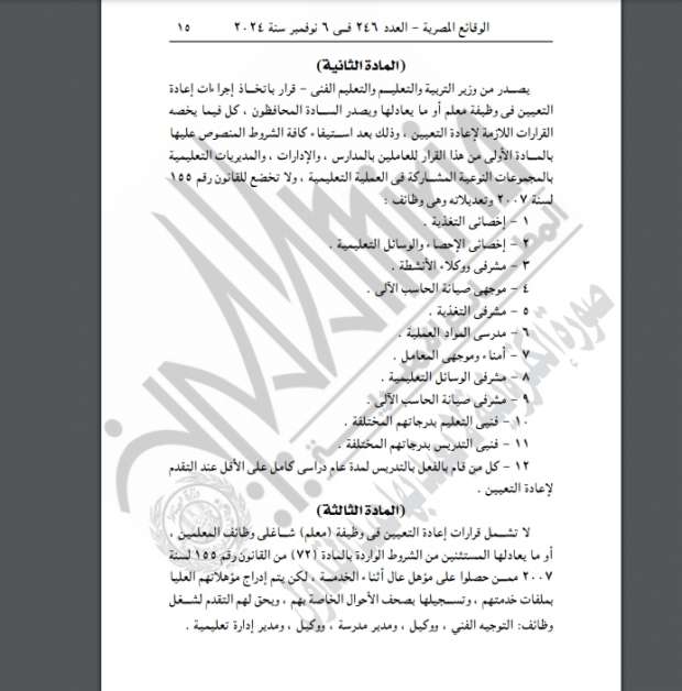 وأضاف وزير التربية والتعليم والتعليم الفني في قراره: يصدر من وزير التربية والتعليم والتعليم الفني قرار باتخاذ إجراءات إعادة التعيين في وظيفة معلم أو ما يعادلها وتصدر المحافظون، كل فيما يخصه القرارات اللازمة لإعادة التعيين، وذلك بعد استيفاء كافة الشروط المنصوص عليها بالسادة الأولى من هذا القرار للعاملين بالمدارس، والإدارات، والمديريات التعليمية بالمجموعات التوعية المشاركة في العملية التعليمية، ولا تخضع للقانون رقم 155 لسنة 2007 وتعديلاته وهي وظائف: