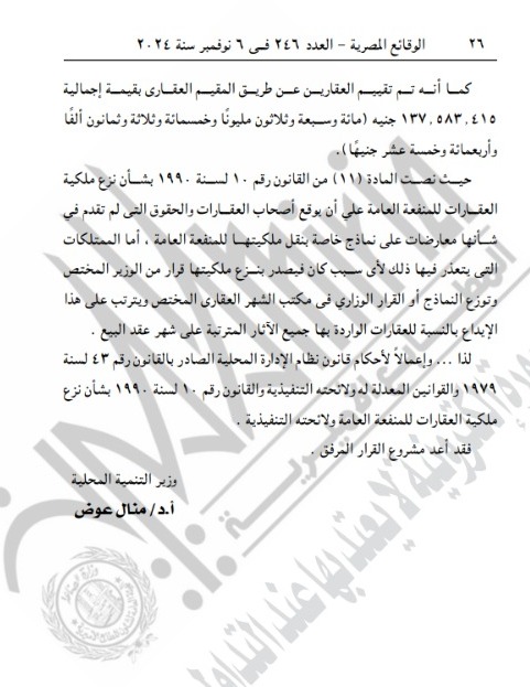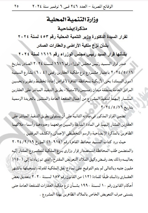وجاء قرار التنمية المحلية، بعد الإطلاع على بعد الاطلاع على الدستور وعلى قرار رئيس مجلس الوزراء، رقم 1428 لسنة 2020، وعلى قانون نظام الإدارة المحلية رقم 43 لسنة 1979، وعلى القانون رقم 10 لسنة 1990 بشأن نزع ملكية العقارات للمنفعة العامة، وعلى قرار رئيس مجلس الوزراء رقم 1817 لسنة 2019، وعلى قرار رئيس مجلس الوزرا - رقم 1616 لسنة 2024 المنشور بالجريدة الرسمية بالعدد رقم (20) بتاريخ 2024 /5/16 باعتبار مشروع نزع ملكية العقارين رقمي 4،6 بشارع السبتية سوق السمك بحي الأزبكية بمحافظة القاهرة الأغراض إعادة تخطيط وتطوير وتحسين المرافق العامة بمنطقة ميدان رمسيس والاستيلاء بطريق التنفيذ المباشر على العقارين المشار إليهما لتنفيذ المشروع.