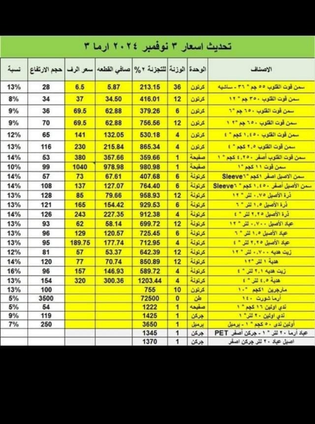وأبقت شركة ألفا للزيوت سعر الكرتونة 12 عبوة 700 ملي عند 576 جنيها لزيت الخليط، وسعر 613 جنيها لزيت عباد الشمس، وسعر كرتونة 12 عبوة سعة 1 لتر بـ 806 جنيهات لزيت الخليط، و852 جنيها لزيت عباد الشمس.