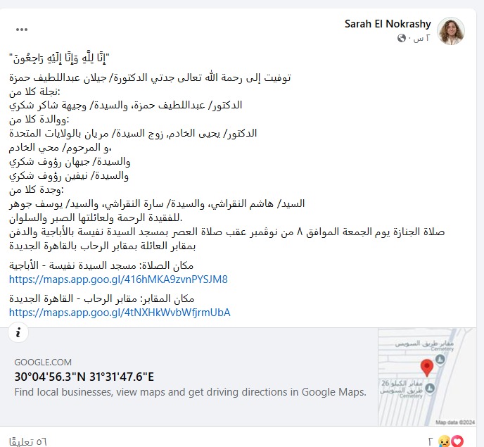 وكتبت عبر حسابها على فيس بوك: إنا لله وإنا إليه راجعون، توفيت إلى رحمة الله تعالى جدتي الدكتورة جيلان عبد اللطيف حمزة.