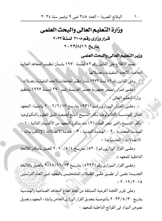 الجريدة الرسمية تنشر قرار تعديل أقسام المعهد العالي للهندسة والتكنولوجيا بكفر الشيخ