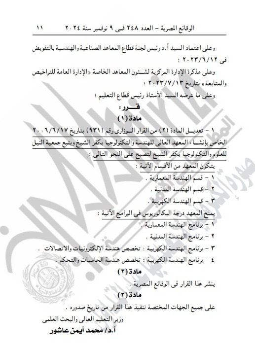 - ونصت المادة الأولى على تعديل المادة 2 من القرار الوزراي رقم 931 بتاريخ 17-6-2006 الخاص بإنشاء المعهد العالي للهندسة والتكنولوجيا بكفر الشيخ ويتبع جمعية النيل للعلوم والتكنولوجيا بكفر الشيخ لتصبح كما يلي: