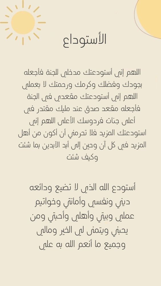 - يا رب إني أستودعك دينك وأستودعك أمانتك فاجعلني في رعايتك من شرور السفر.