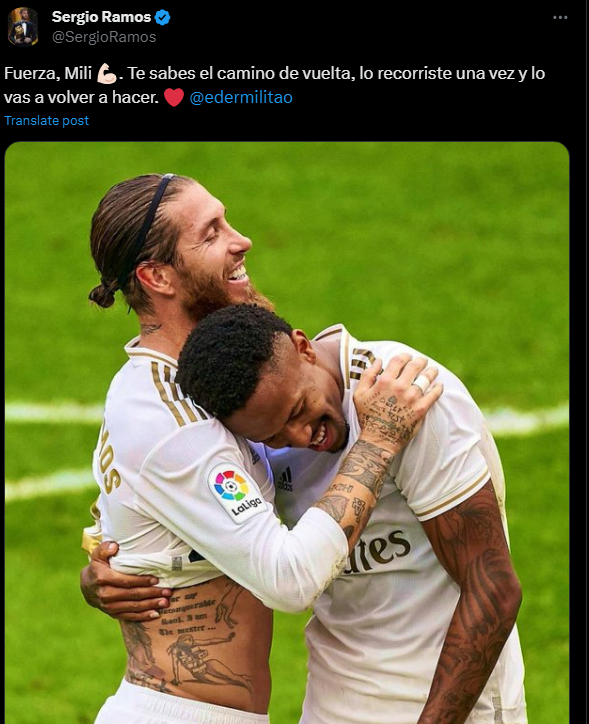 دعم سيرجيو راموس مدافع نادي ريال مدريد السابق، إيدير ميليتاو مدافع الفريق الحالي، عقب تعرضه للإصابة بقطع في الرباط الصليبي الأمامي في الساق اليمنى.