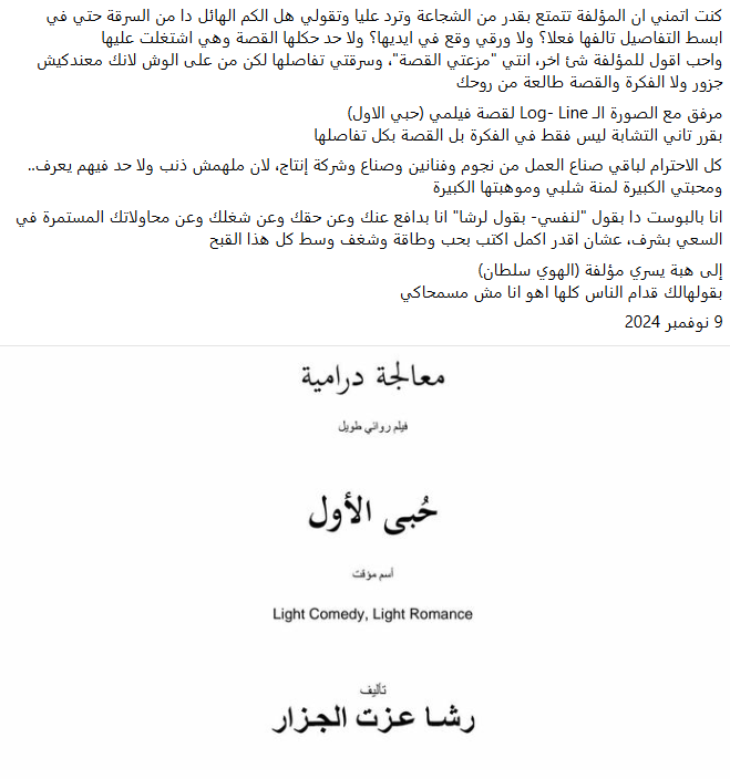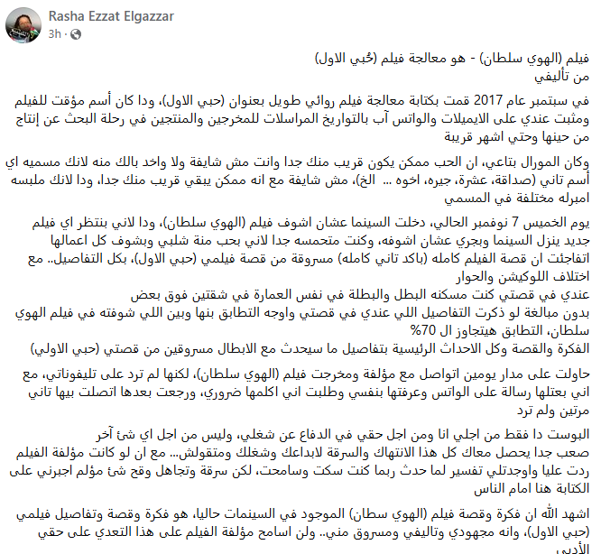 وواصلت: بدون مبالغة لو ذكرت التفاصيل اللي عندي في قصتي وأوجه التطابق بينها وبين اللي شفته في فيلم الهوي سلطان، التطابق هيتجاوز الـ 70%، الفكرة والقصة وكل الأحداث الرئيسية بتفاصيل ما سيحدث مع الأبطال مسروقين من قصتي (حبي الأول)، حاولت على مدار يومين أتواصل مع مؤلفة ومخرجت فيلم الهوي سلطان، لكنها لم ترد على تليفوناتي، مع أني بعتلها رسالة على واتساب وعرفتها بنفسي وطلبت إني أكلمها ضروري، ورجعت بعدها اتصلت بيها تاني مرتين ولم ترد.. البوست دا فقط من أجلي أنا ومن أجل حقي في الدفاع عن شغلي، وليس من أجل أي شيء آخر.