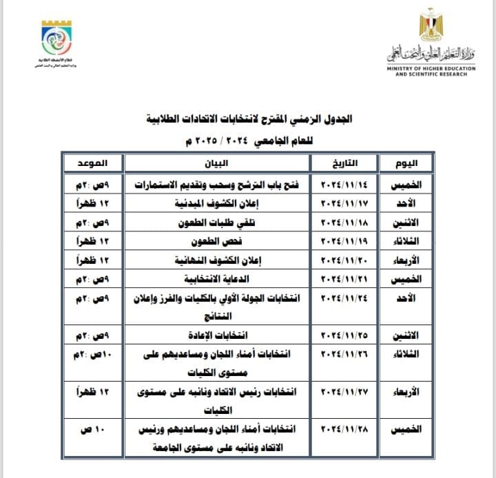 ووفقًا للجدول الزمني المُعتمد من وزير التعليم العالي والبحث العلمي، سيتم فتح باب الترشح يوم 14 نوفمبر الجاري، وإعلان الكشوف المبدئية يوم 17 نوفمبر، وتلقي طلبات الطعون يوم 18 نوفمبر، وفحص الطعون يوم 19 نوفمبر، على أن يتم إعلان الكشوف النهائية يوم 20 نوفمبر، وتبدأ الدعاية الانتخابية يوم 21 نوفمبر، وتقام انتخابات الجولة الأولى بالكليات والفرز وإعلان النتائج يوم 24 نوفمبر، وتقام جولة الإعادة يوم 25 نوفمبر، ثم تقام انتخابات أمناء اللجان ومساعديهم على مستوى الكليات يوم 26 نوفمبر، وتقام انتخابات رئيس الاتحاد ونائبه على مستوى الكليات يوم 27 نوفمبر، على أن تنتهي الانتخابات الطلابية بانتخاب أمناء اللجان ومساعديهم ورئيس ونائب رئيس اتحاد الجامعة يوم 28 نوفمبر 2024.