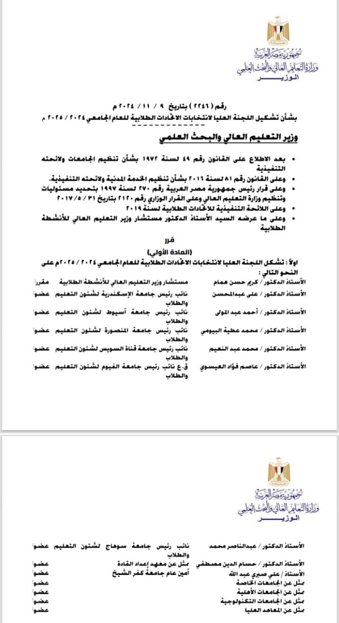 وأصدر الدكتور أيمن عاشور قرارًا بتشكيل اللجنة العليا لانتخابات الاتحادات الطلابية للعام الجامعي 2024/2025 للإشراف على العملية الانتخابية ومتابعتها على مستوى الجامعات بمختلف أنحاء الجمهورية.