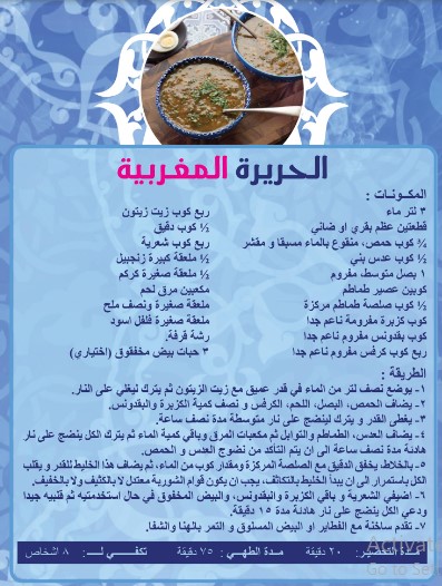 4. الحريرة: هي شوربة مغربية تقليدية، تقدم عادة خلال شهر رمضان. تتكون الحريرة من مجموعة متنوعة من المكونات، مثل العدس والحمص والشعير، وتتبل بالكثير من البهارات.