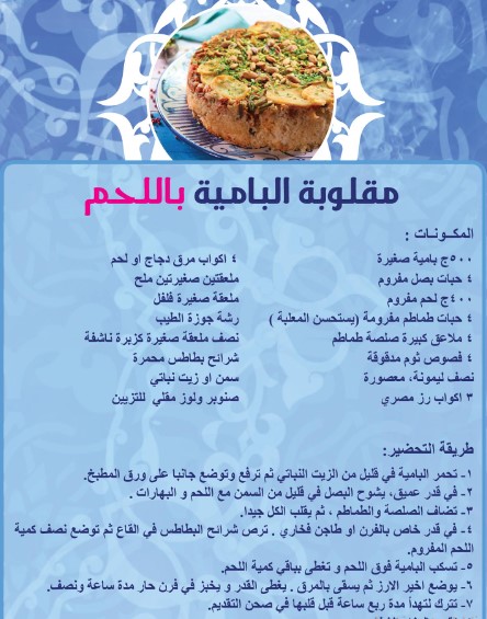 مقلوبة البامية باللحم أحد أشهر أكلات مغربية باللحم تقدم في المطاعم المغربية، فهي تجمع بين الخضروات والبروتين في مزيج رائع سهل تحضيره كما يوضح في الصورة التالية: