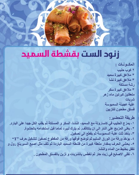 6. السفة: هي حلوى مغربية تقليدية، تقدم عادة في المناسبات الخاصة. تتكون السفة من طبقات من العجين الرقيق، تحشى بالمكسرات والسكر والقرفة، وتقدم ساخنة.