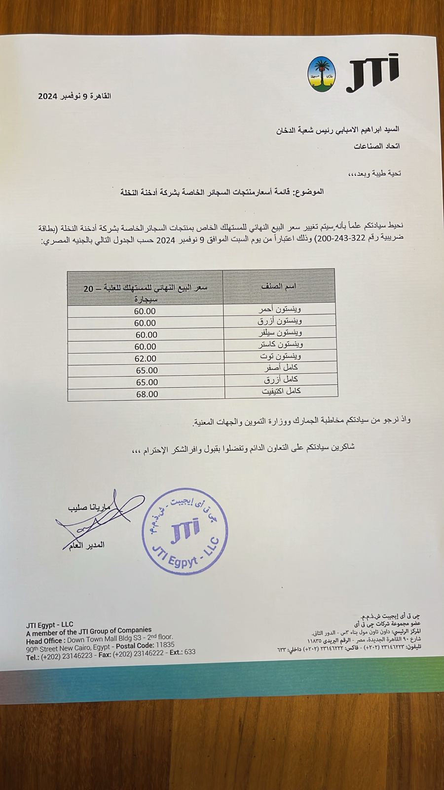 وفي وقت سابق، قال إبراهيم إمبابي نائب رئيس شعبة الدخان بغرفة الصناعات الغذائية باتحاد الصناعات، لـ القاهرة 24، إن شركة أدخنة النخلة، إحدى مجموعة شركات جابان توباكو إنترناشونال JTI، قررت رفعت منتجاتها.