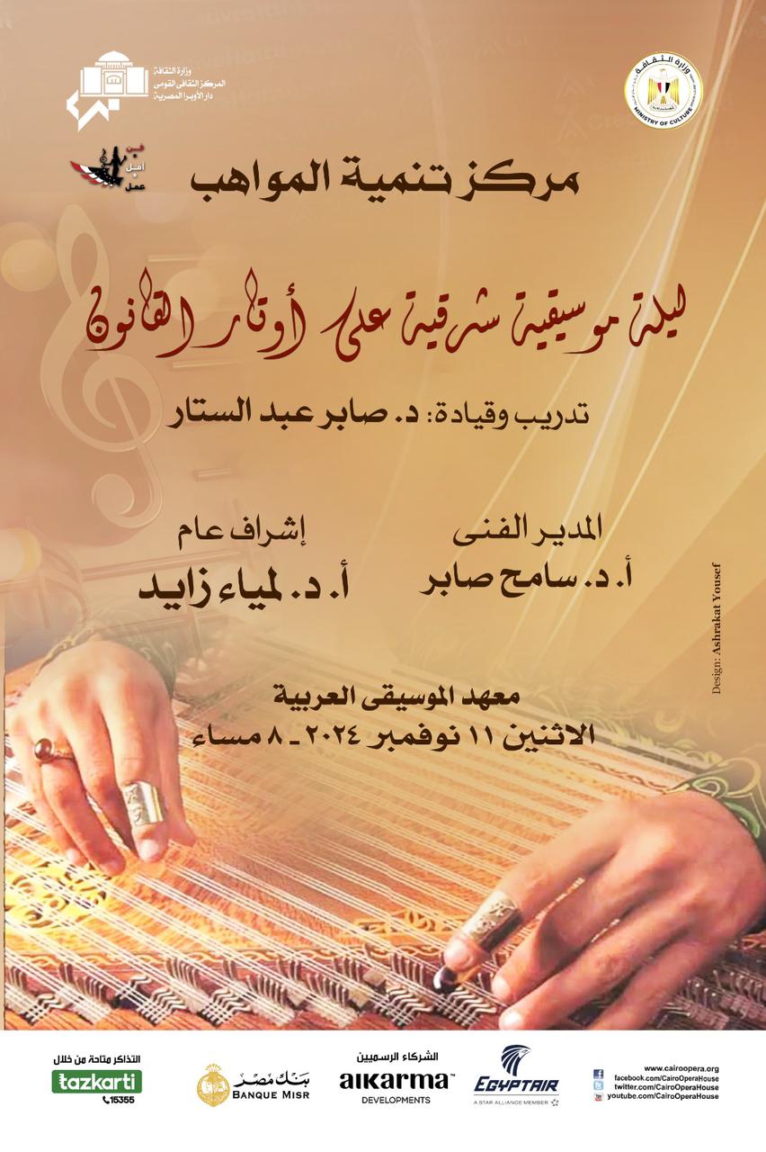 تنظم دار الأوبرا المصرية، برئاسة الدكتورة لمياء زايد، حفلًا لمركز تنمية المواهب تحت إشراف مديره الفني الدكتور سامح صابر، بعنوان ليلة موسيقية شرقية على أوتار القانون، يحييه الواعدين بفصل القانون تدريب وقيادة دكتور صابر عبد الستار، وذلك في الثامنة مساء اليوم الاثنين الموافق 11 نوفمبر على مسرح معهد الموسيقي العربية.
