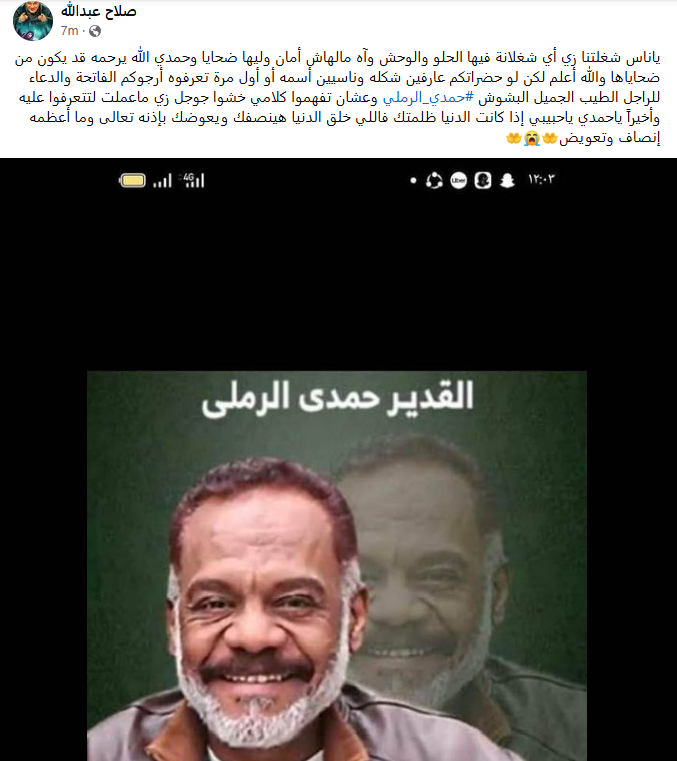 رحل عن عالمنا حمدي الرملي اليوم، وأقيمت الجنازة في مسجد بمدينة العبور واستقبل أهله العزاء في مسجد الخلفاء الراشدين بمنطقة الجيزة، نعاه عدد كبير من نجوم الفن ومنهم صلاح عبدالله من خلال حسابة الخاص فيس بوك قائلًا: يا ناس شغلتنا زي أي شغلانة فيها الحلو والوحش وآه مالهاش أمان وليها ضحايا وحمدي الله يرحمه قد يكون من ضحاياها والله أعلم لكن لو حضراتكم عارفين شكله وناسيين أسمه أو أول مرة تعرفوه أرجوكم الفاتحة والدعاء للراجل الطيب الجميل البشوش حمدي الرملي وعشان تفهموا كلامي خشوا جوجل زي ما عملت لتتعرفوا عليه وأخيرًا يا حمدي يا حبيبي إذا كانت الدنيا ظلمتك فاللي خلق الدنيا هينصفك ويعوضك بإذنه تعالى وما أعظمه إنصاف وتعويض.