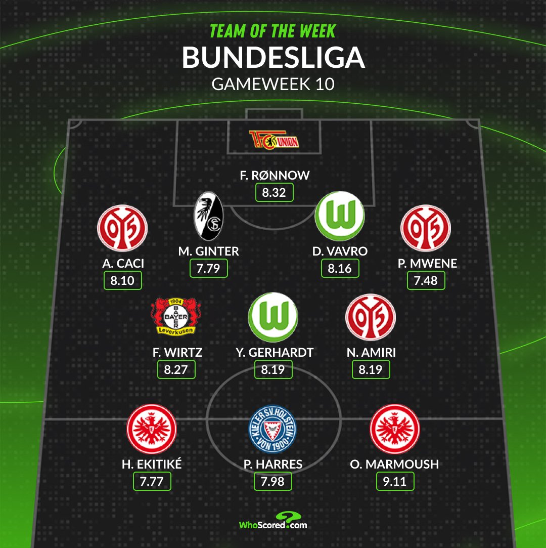 ونشر موقع WhoScored العالمي التشكيل المثالي في الدوري الألماني للجولة العاشرة من البطولة والتي تواجد فيها النجم المصري عمر مرموش.