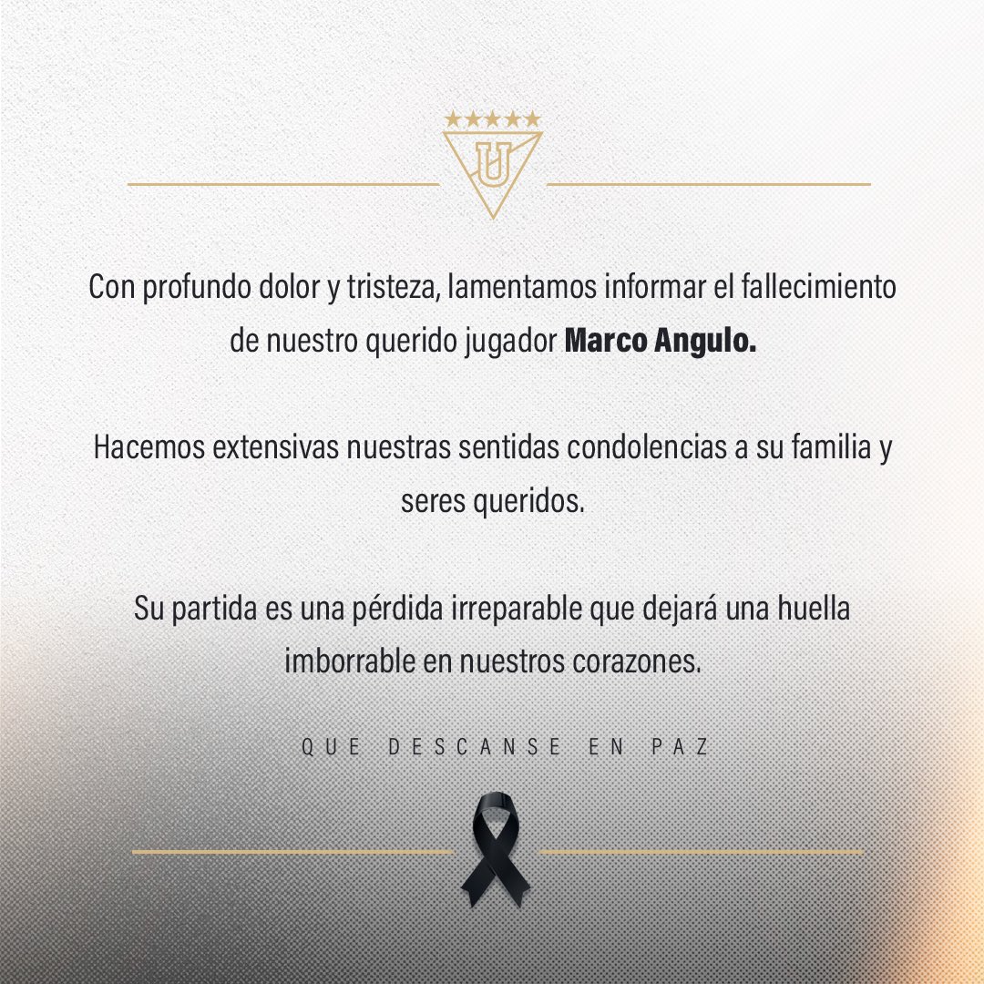 وقال نادي ليجا دي كيتو عبر حسابه الرسمي على موقع التواصل الاجتماعي إكس: ببالغ الحزن والأسف، ننعى رحيل لاعبنا ماركو أنجولو، مقدمين تعازينا الحارة ولعائلته ولأحبائه، إنها لخسارة كبيرة ألقت في قلوبنا حزن لا يطاق.