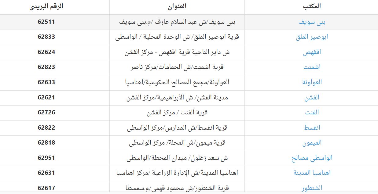- مكتب بريد بني سويف: شارع عبد السلام عارف بمنطقة بني سويف.